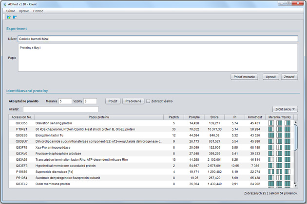 Softvér načítava dáta z experimentálnych meraní zo súborov v csv formáte. Všetky proteíny v rámci experimentu prezentuje vo forme tabuľky, prostredníctvom ktorej zobrazuje príslušnosť jednotlivých proteínov k meraniam a vzorkám. Zabezpečuje dostupnosť stručných aj detailných informácií o proteíne, eliminuje redundantné proteíny, dopočítáva a zobrazuje molekulové hmotnosti a hodnoty izoelektrického bodu. Umožňuje filtrovať proteíny, ktoré neboli identifikované dostatočným počtom meraní, zmazať zvolený proteín z experimentu a aktualizovať údaje o proteínoch získané z externých databáz. Identifikované proteíny experimentu je možné exportovať do Excelu, pričom softvér umožňuje voľbu, ktoré z dostupných údajov o proteíne sa do exportu zahrnú.